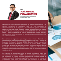 La contaduría pública atraviesa un momento de profunda transformación. Los cambios normativos, la fiscalización cada vez más sofisticada, la internacionalización de los negocios y la evolución del ejercicio profesional exigen hoy, más que nunca, una visión integral, técnica y humana de nuestra profesión. En este contexto, la segunda edición 2025-2026 de la Revista de la Región Centro Occidente del IMCP reúne reflexiones que dialogan entre sí y que permiten al lector comprender los retos actuales desde distintas aristas del quehacer contable.